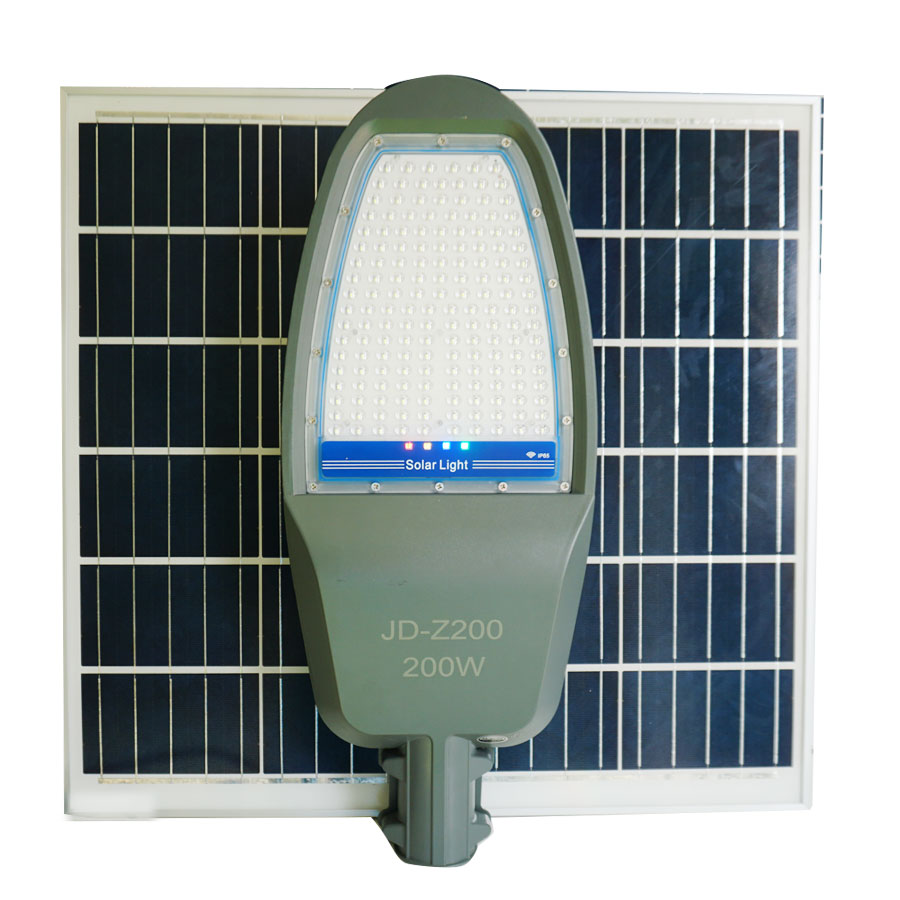 Đèn đường năng lượng mặt trời 200w cao cấp JD-Z200 là mẫu đèn đường năng lượng có công suất chiếu sáng 200W, dòng đèn có công suất cao thường được lắp đặt cho các công trình đèn đường nông thôn liên ấp, liên xã, lắp đặt chiếu sáng sân vườn, chiếu sáng cổng rào,…